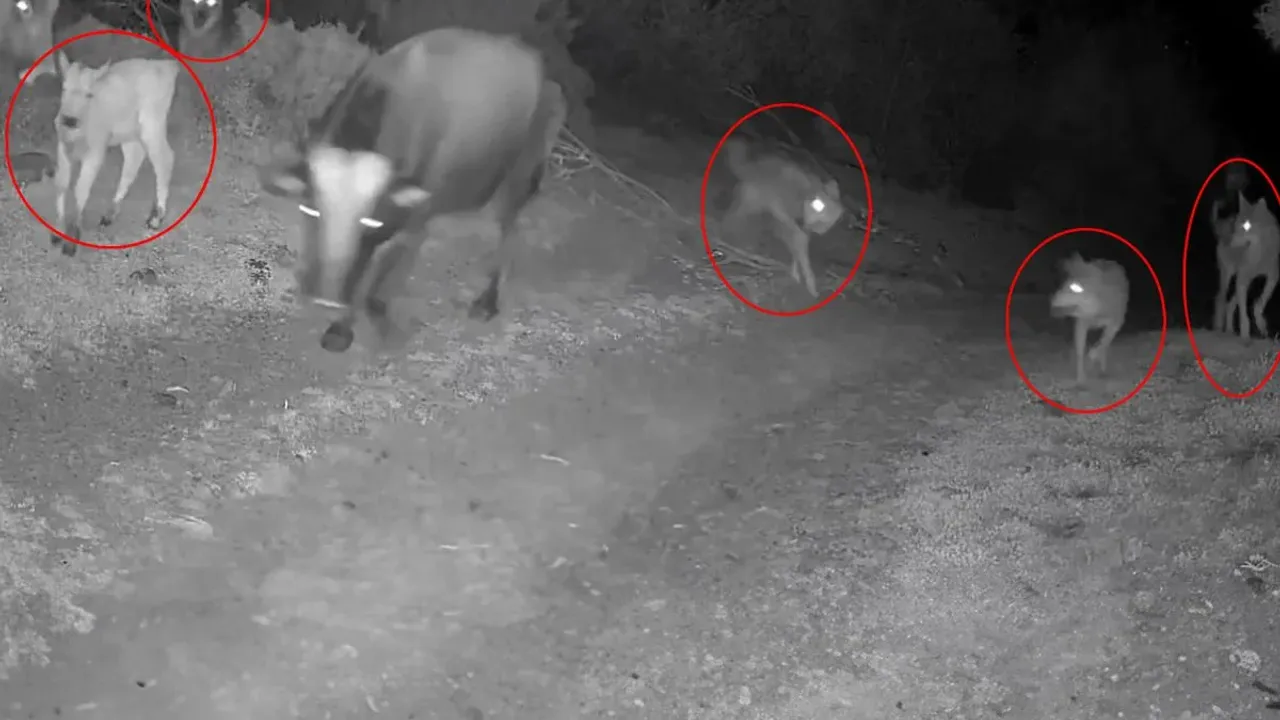 Gecenin karanlığında gerçekleşen olayda, kurt sürüsünün anne ineği ve buzağıyı çevrelediği anlar net şekilde görüntülendi.