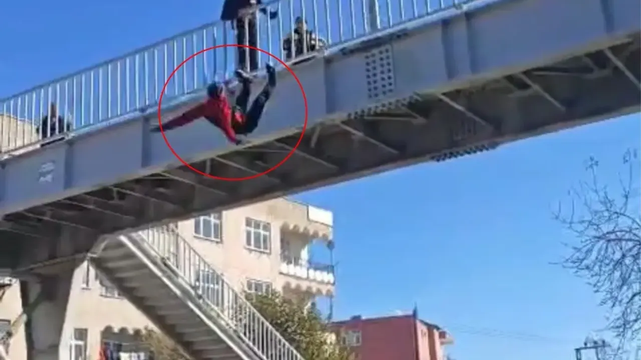 Diyarbakır’ın Ergani ilçesinde üstgeçide çıkan bir kişi çevredekilerin dikkatini çekti. Riskli şekilde korkuluklarda duran C.H. isimli şahıs için bölgeye sağlık, itfaiye ve polis ekipleri sevk edildi. Olay anı çevredeki kameralar tarafından kaydedildi.