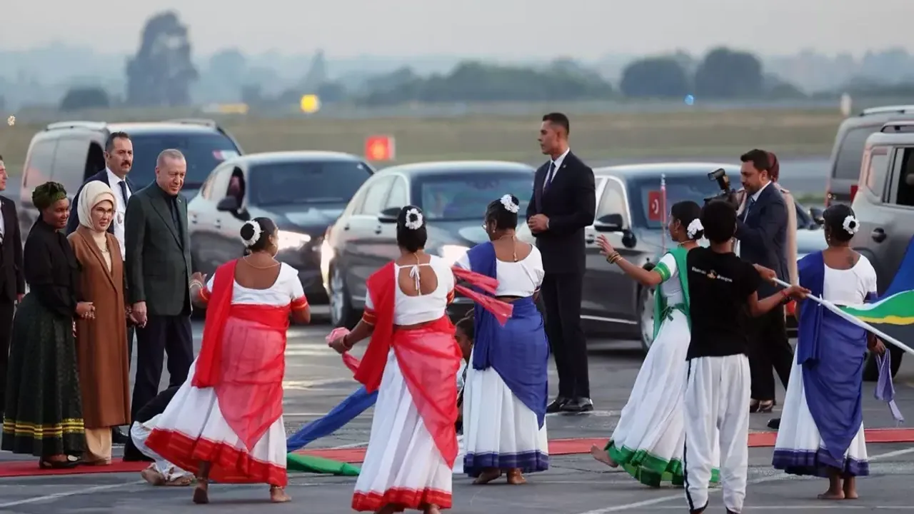 Cumhurbaşkanı Erdoğan ve eşi Emine Erdoğan, Johannesburg’daki O. R. Tambo Uluslararası Havalimanı’na geldiklerinde, Güney Afrika Konut, Su ve Esenlik Bakanı Thembisile Simelane ile Türkiye’nin Pretorya Büyükelçisi Kezban Nilvana Darama Yıldırımgeç tarafından karşılandı.