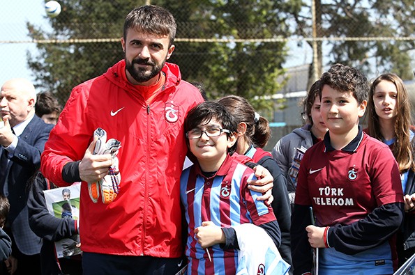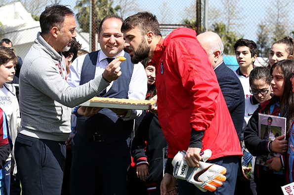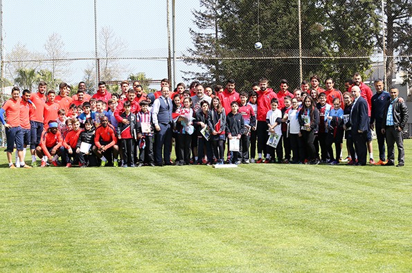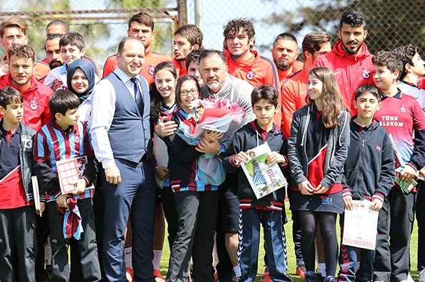 Antrenman öncesi bordo mavili ziyaret eden özel bir ilköğretim okulu öğrencileri, teknik heyet ve futbolcularla fotoğraf çektirdi.