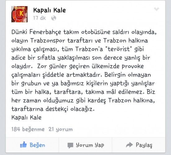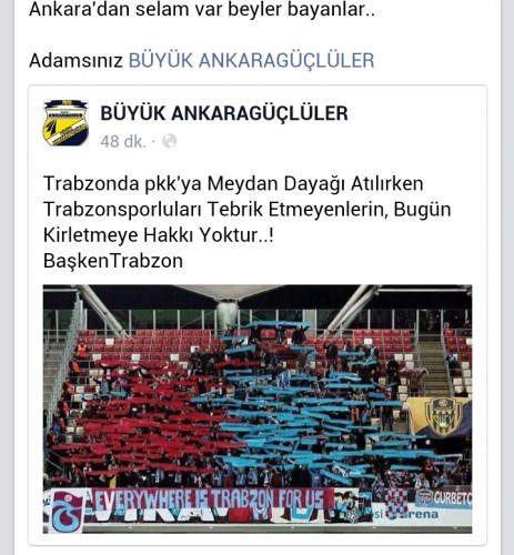 Trabzon'da dün akşam saatlerinde Fenerbahçe kafilesine yapılan saldırının ardından Trabzon Halkına destek veren Ankaragücü, Bursa ve Kayserispor'un taraftar grupları yayınladıkları mesajlar ile sosyal medyada alkış topladı. işte o mesajlar