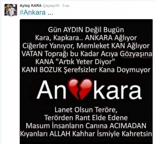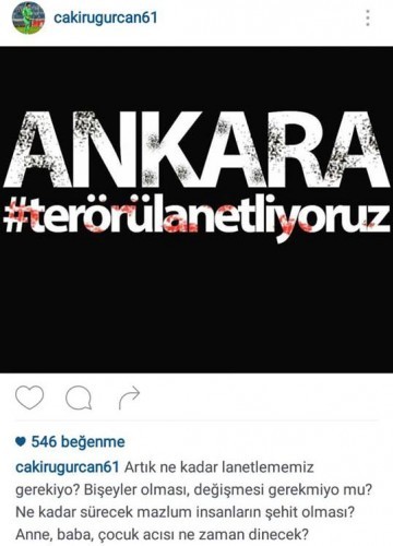 "Umut kardeşim doğum gününde babasını toprağa verecek. Bin bir zorlukla, güçlükle, emekle onu büyütüp, yetiştirip topluma kazandıran babasını. Terör insan ayrımı yapmıyor, sen, ben fark etmiyor. Sadece Umut'un hikayesi değil, onlarca, yüzlerce masum insanın böyle hikayesi var. Kemal amca, Peri, Dorukhan, Ozancan, Mehmet Emre ve diğerleri... Kimi kendini yetiştiren anne, babasını, kimi yetiştirip güzel bir hayat düşlediği oğlunu, kızını, kardeşini kaybediyor. Allah'ım sabır ver."