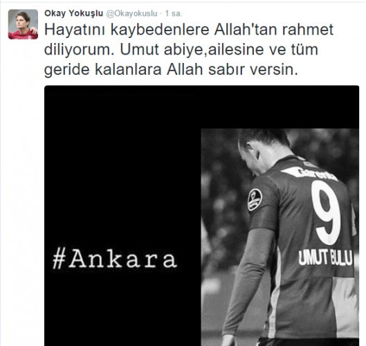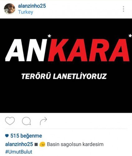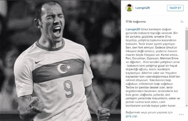 Beşiktaş'ta forma giyen milli kaleci Tolga Zengin, Ankara saldırısına tepki göstererek babasını bu saldırıda kaybeden Umut Bulut'a destek verdi.