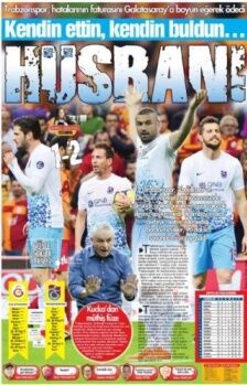 Taka gazetesi, “İstanbul’da hüsran”, “Zafer umuduyla Galatasaray karşısına çıkan Trabzonspor, hayal kırıklığı yaşattı” ifadelerini kullandı.