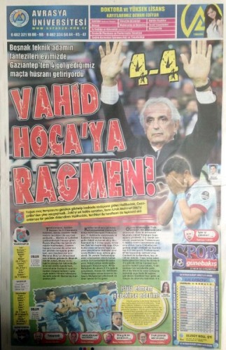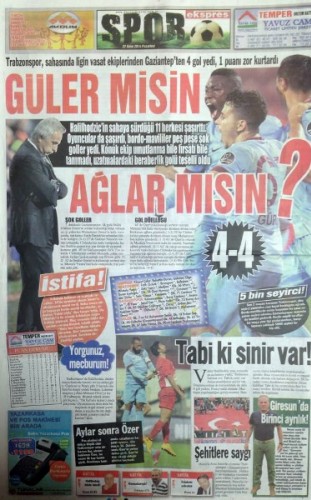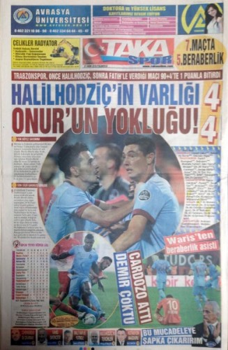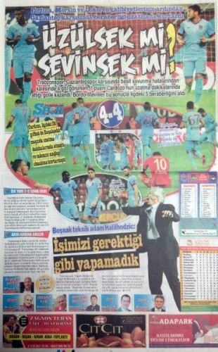 Trabzonspor, sahasında ligin vasat ekiplerinden Gaziantepspor'dan 4 gol yedi 1 puanı zor kurtardı. Halilhodzic'in sahaya sürdüğü 11 herkesi şaşırttı. Oyuncularda şaşırdı, Bordo Mavililer peş peşe çok goller yedi. Konuk ekip umutlanma fırsatı bile tanımadı. Uzatmalardaki beraberlik golü teselli oldu.