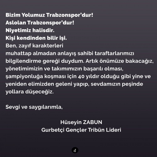 Bizim Yolumuz Trabzonspor’dur! Aslolan Trabzonspor’dur! Niyetimiz halisdir. Kişi kendinden bilir işi. Ben, zayıf karakterleri muhattap almadan anlayış sahibi taraftarlarımızı bilgilendirme gereği duydum. Artık önümüze bakacağız, yönetimimizin ve takımımızın başarılı olması, şampiyonluğa koşması için 40 yıldır olduğu gibi yine ve yeniden elimizden geleni yapıp, sevdamızın peşinde yollara düşeceğiz.