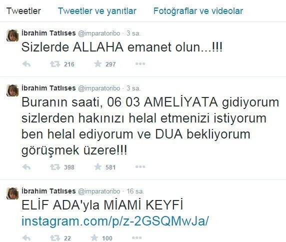 “Sayın İbrahim Tatlıses’in Türkiye saatiyle bugün öğleden sonra girdiği ameliyat başarıyla sonuçlanmıştır. İbrahim Tatlıses’in sağlık durumu gayet iyidir. Arayan soran, iyi dileklerini ve dualarını gönderen tüm dostlarına ve sevenlerine teşekkür ederiz.”