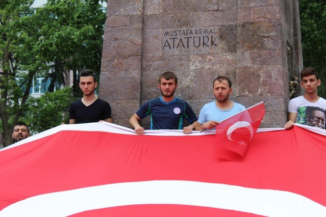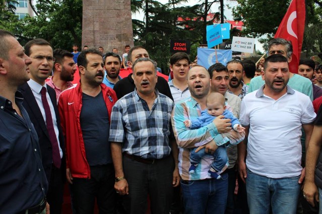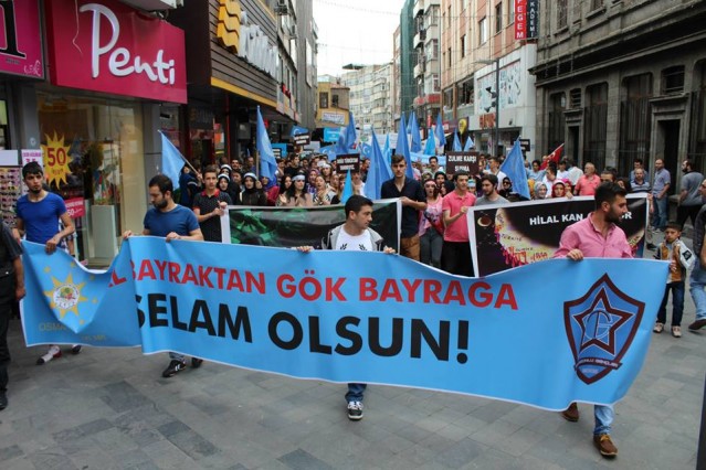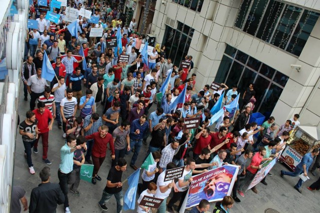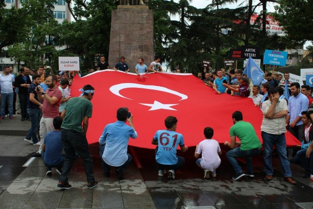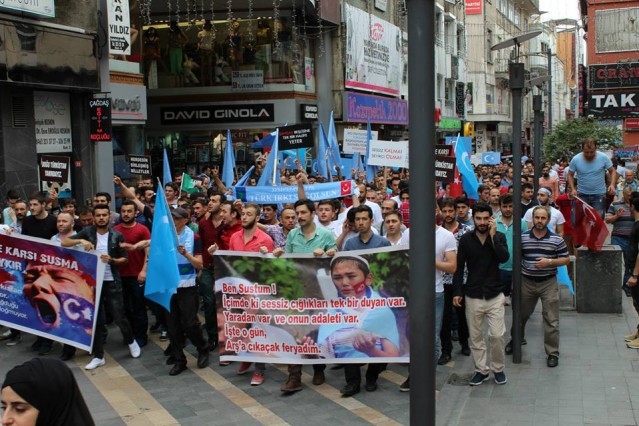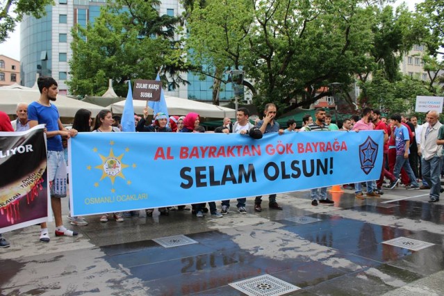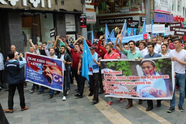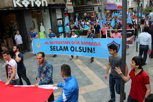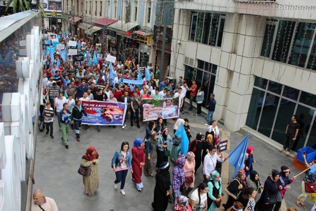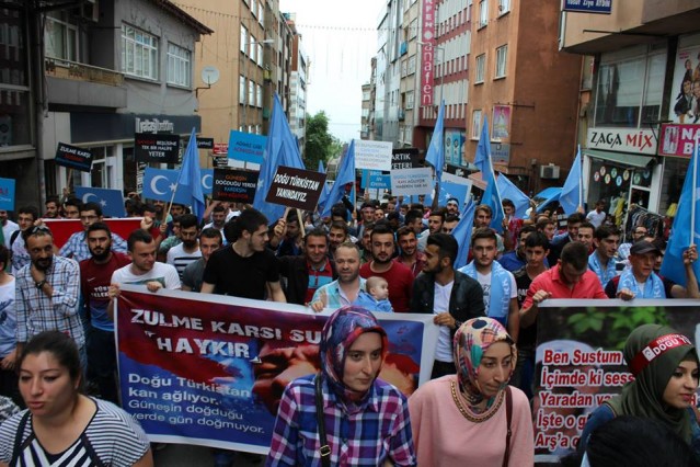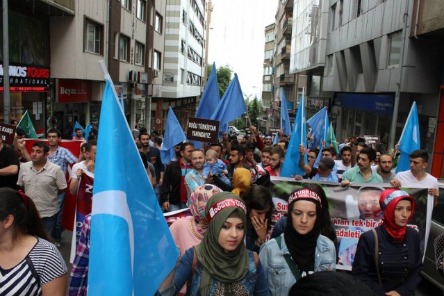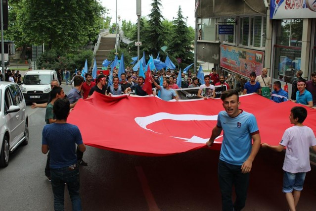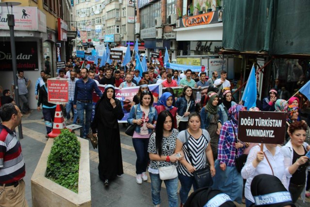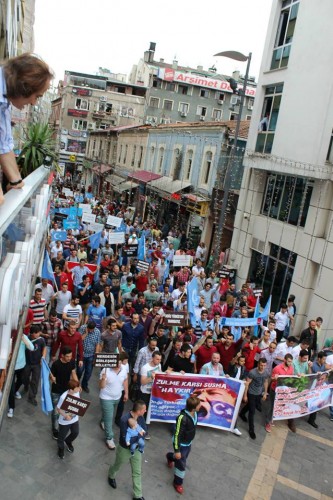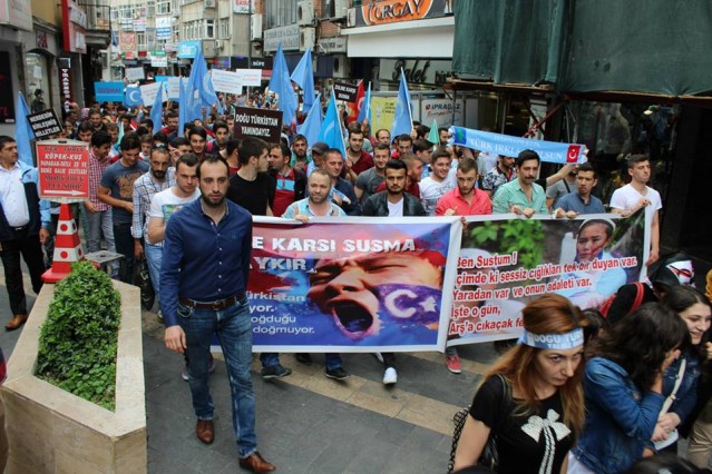 Cumhuriyet caddesindeki eski TEDAŞ binası önünden başlayan yürüyüşün ardından Atatürk Anıtı önüne gelen kalabalık grup burada Çin'in Doğu Türkistan'da uyguladığı zulmü sloganlarla protesto etti.