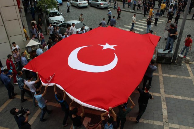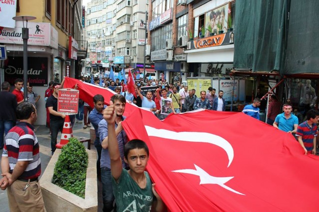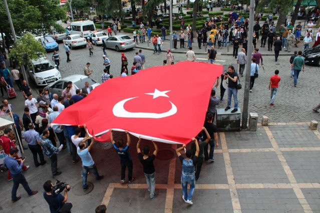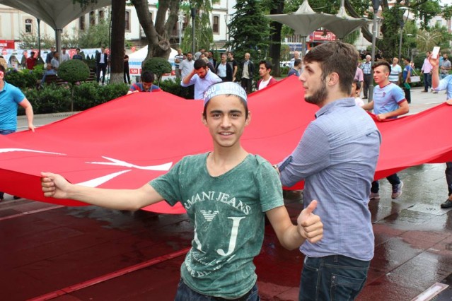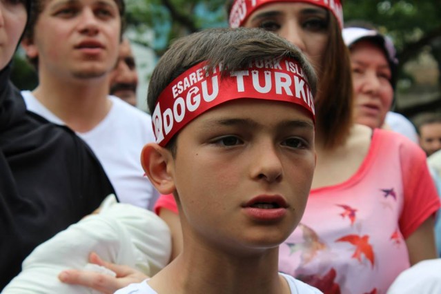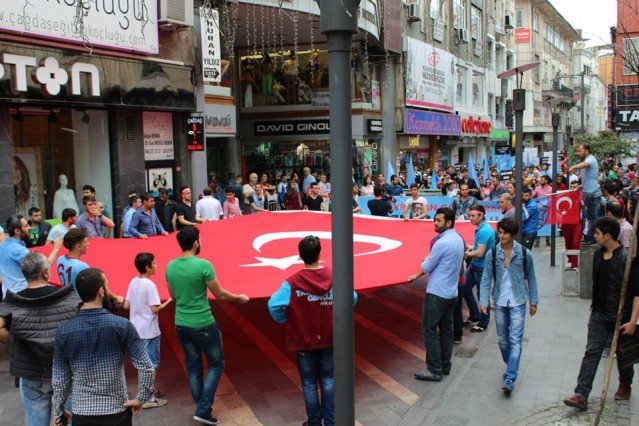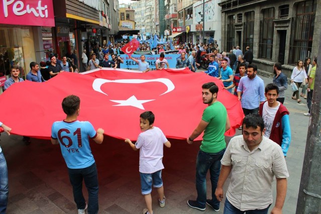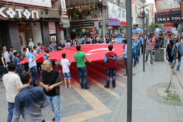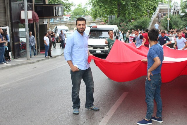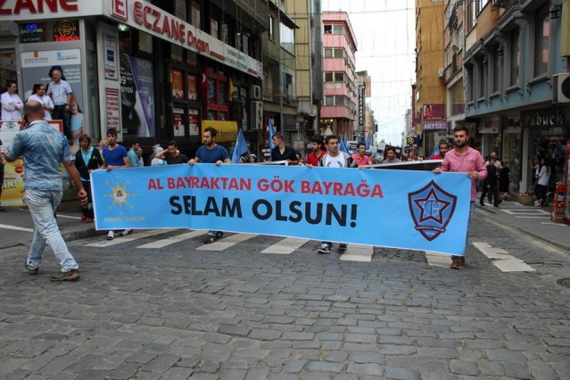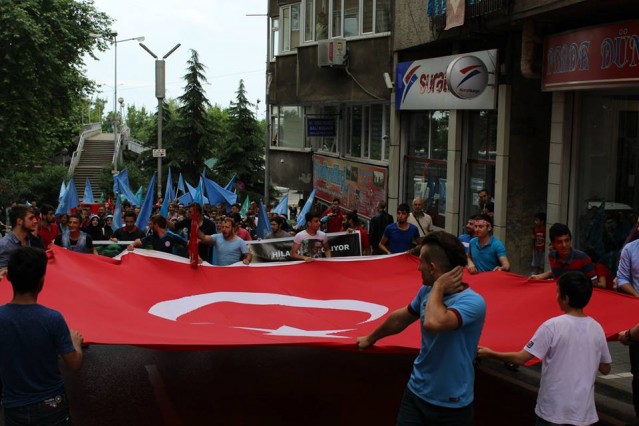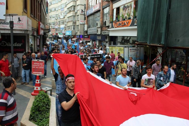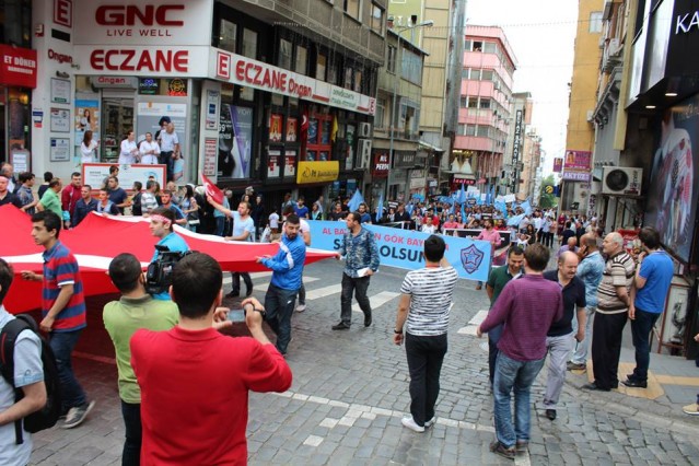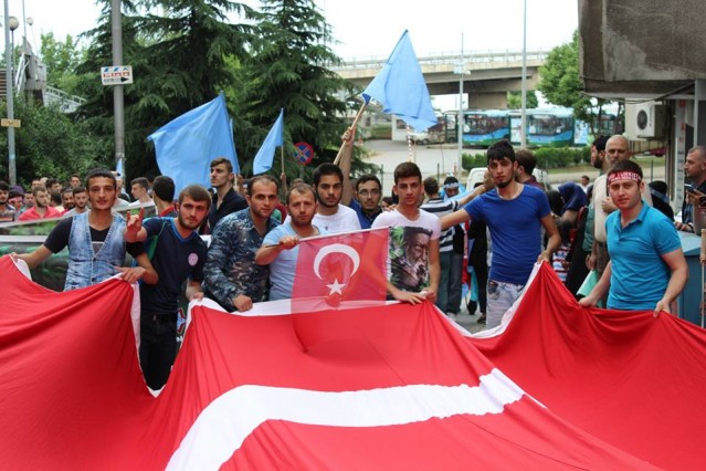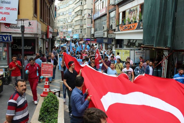 Cumhuriyet caddesindeki eski TEDAŞ binası önünden başlayan yürüyüşün ardından Atatürk Anıtı önüne gelen kalabalık grup burada Çin'in Doğu Türkistan'da uyguladığı zulmü sloganlarla protesto etti.