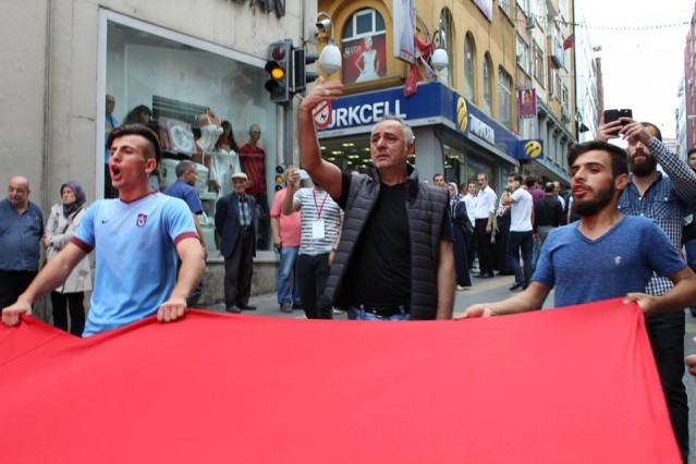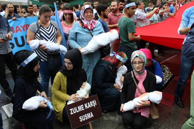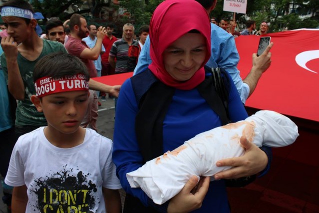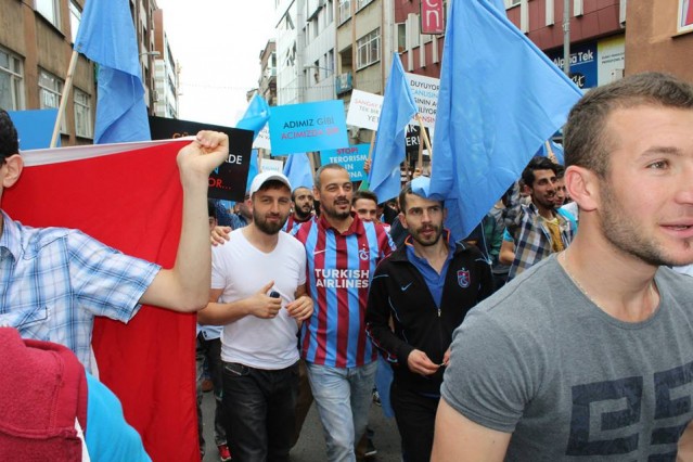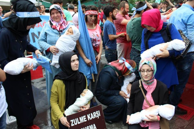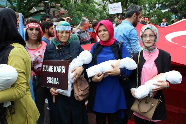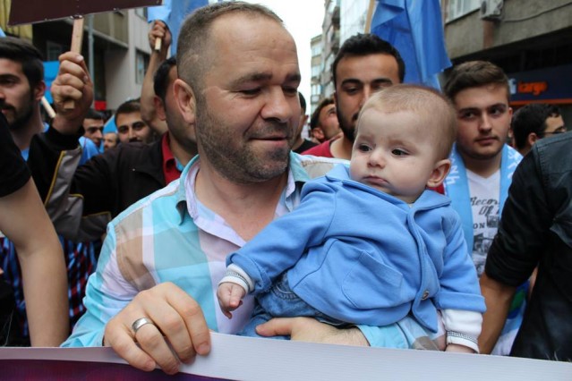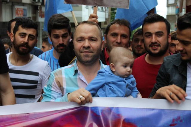 'Trabzonlu Gençler" Trabzonspor taraftar grubu tarafından düzenlenen protesto yürüyüşünde kadınların kucaklarında kanlı kefenlere sarılı oyuncak bebekler dikkat çekti.