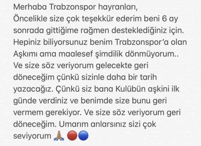 Merhaba Trabzonspor hayranları, öncelikle size çok teşekkür ederim beni 6 ay sonrada gittiğime rağmen desteklediğiniz için. Hepiniz biliyorsunuz benim Trabzonspor’a olan aşkımı ama maalesef şimdilik dönmüyorum. Ve size söz veriyorum gelecekte geri döneceğim çünkü sizinle daha bir tarih yazacağız. Çünkü siz bana kulübün aşkını ilk günde verdiniz ve benimde size bunu geri vermem gerekiyor. Ve size söz veriyorum geri döneceğim. Umarım anlarsınız sizi çok seviyorum.''