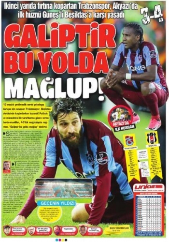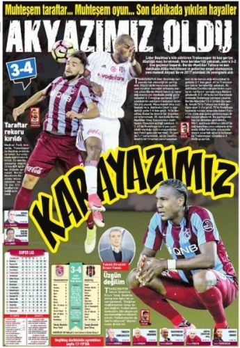 Yerel gazeteler, Spor Toto Süper Lig’in 27’nci haftasında sahasında Beşiktaş’a 4-3 mağlup olan Trabzonspor’un ortaya koyduğu performanstan memnun kaldı, ‘Galiptir bu yolda mağlup’ yorumunu yaptı. Günebakış Gazetesi, "Galiptir bu yolda mağlup!", "10 maçlık yenilmezlik serisi yakalayıp Avrupa için savaşan Trabzonspor, Beşiktaş derbisinde kaybederken kazandı! Futbolu ve mücadelesi ile taraftarlarına güven veren bordo mavililer, 4-3’lük mağlubiyete rağmen, 'Galiptir bu yolda mağlup’ dedirtti" ifadelerini kullandı.