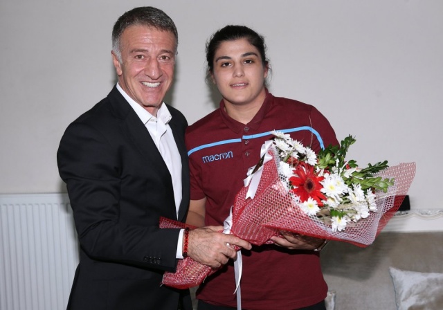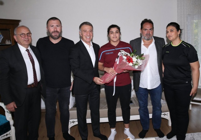 Trabzonspor Kulübü Başkanı Ahmet Ağaoğlu, Asbaşkan Mehmet Yiğit Alp ve Amatör Branşlardan sorumlu yönetim kurulu üyesi Yusuf Hayırlıoğlu, Dünya Şampiyonu olan boksör Busenaz Sürmeneli’yi evinde ziyaret etti.