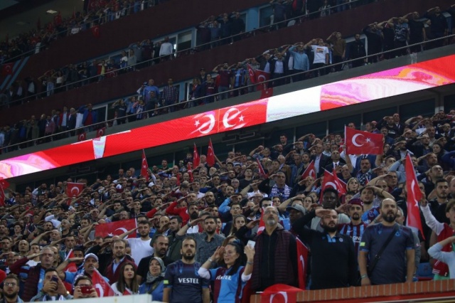 Barış Pınarı Harekatı’na destek için bordo mavili taraftarlar dağıltan Türk bayraklarının karşılaşma öncesi açtı.
