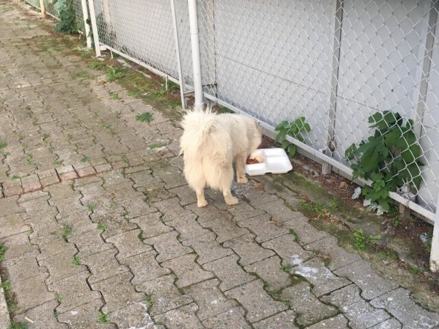 Futbolcular ile sahada uzun süre oynayan köpeğin aç olduğu fark edilince kendisine yemek verildi.