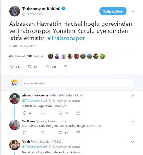 15 Eylül 2010 tarihinde Trabzonspor'un Twitter hesabından yapılan paylaşıma hiç yorum gelmezken, Trabzonsporlu taraftarlar tam 8 yıl sonra o paylaşımı RT yapınca olanlar oldu.