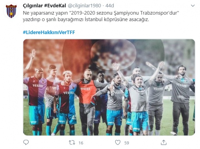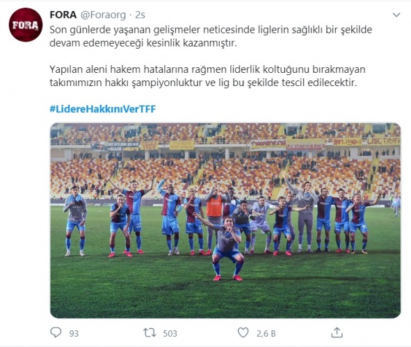 Trabzonsporlu taraftarlar, #LidereHakkınıVerTFF etiketi ile tepkilerini dile getirerek gündeme taşıdı. Bordo mavili ekibin taraftarları bu şartlar altında maçların oynanmasının tehlikeli olacağını savunarak Trabzonspor'a hakkı olan şampiyonluğun verilmesini talep etti.