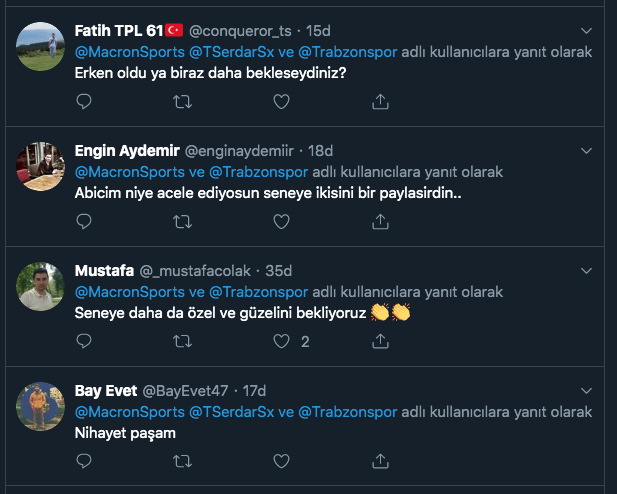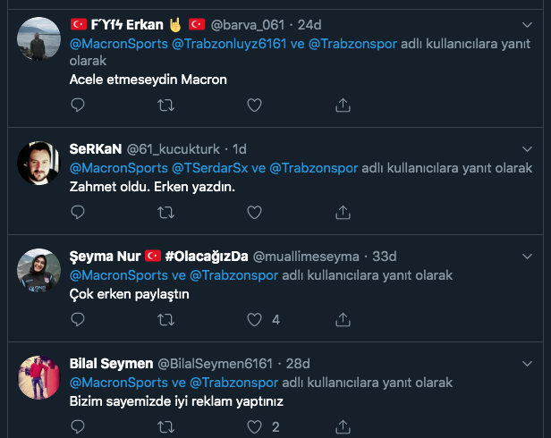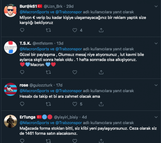 Trabzonsporlu taraftarlar Macron firmasına 5 gün sonra paylaşım yaptığı için tepki gösterdi.
