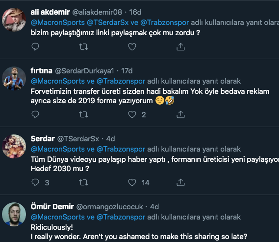 Aradan geçen zaman zarfında Trabzonspor ile ilgili bir paylaşım yapmayan forma üretim firması Macron’a tepkiler gecikmedi.
