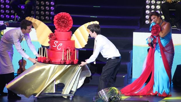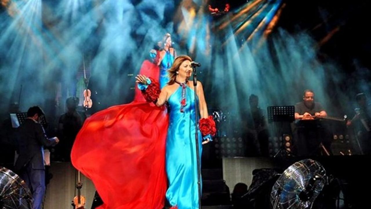 Sahneye Canan Yaka imzalı bordo mavi kostümüyle çıkan Sibel Can, 45 yaşına girdi