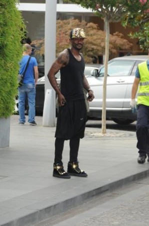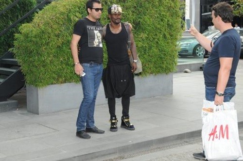 Botları, şalvarı ve süslü şapkasıyla bakışları üzerine toplayan futbolcu kız arkadaşıyla bir kafeye giriyor