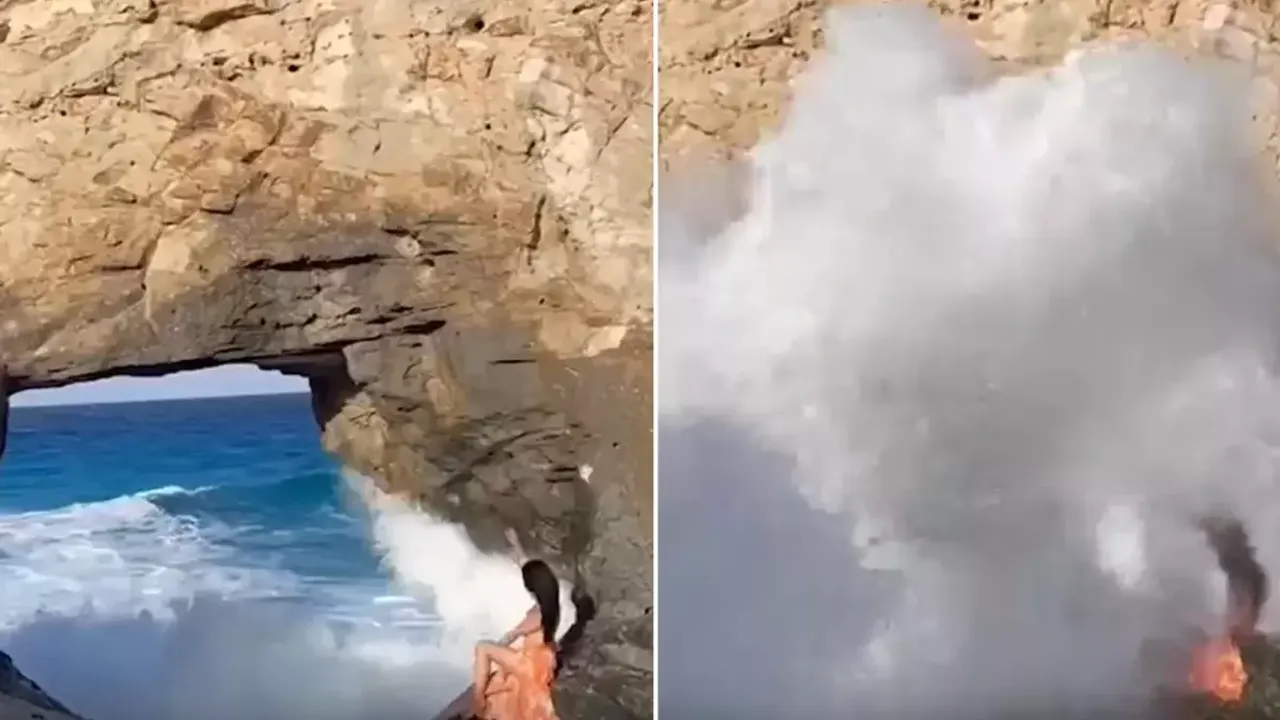 Güçlü dalganın etkisiyle dengesini kaybeden kadın, kayalıkların üzerinden denize savruldu. Çevredeki ziyaretçilerin şaşkın bakışları arasında yaşanan olay, saniyeler içinde paniğe dönüştü. Turistin sürüklendiği anlar cep telefonu kameralarına saniye saniye yansıdı.
