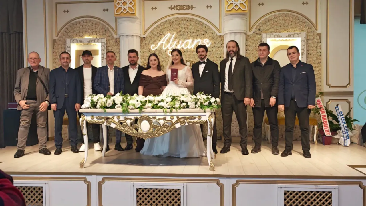 Alyans Düğün Salonu’nda düzenlenen törende, çiftin yakınları ve meslektaşları bu özel günlerinde yalnız bırakmadı. Nikah töreni, yoğun katılım ve coşkulu atmosferle gerçekleşti.