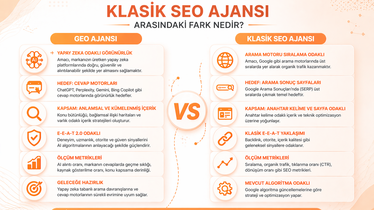 Bu beş alandaki fark klasik SEO ajansının yeniden yapılanmasını zorunlu kıldı. Yapılanmayı başaran ajanslar GEO kategorisine evrildi.