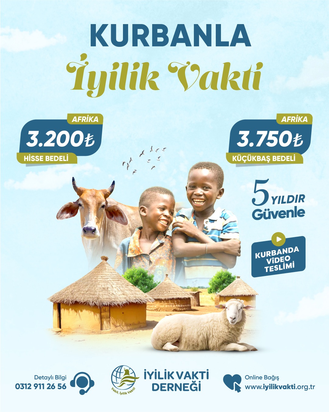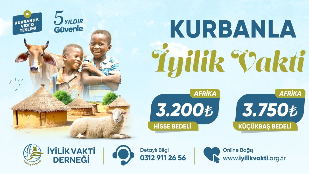 İyilik Vakti Derneği, bu yıl da Afrika başta olmak üzere toplamda 3 kıtada ve 12 ülkede vacip kurban kesim organizasyonu gerçekleştirecek. Dernek yetkililerinin açıklamasına göre 2025 yılı vacip kurban hisse bedeli 3.200 TL, küçükbaş kurban bedeli ise 3.750 TL olarak belirlendi.