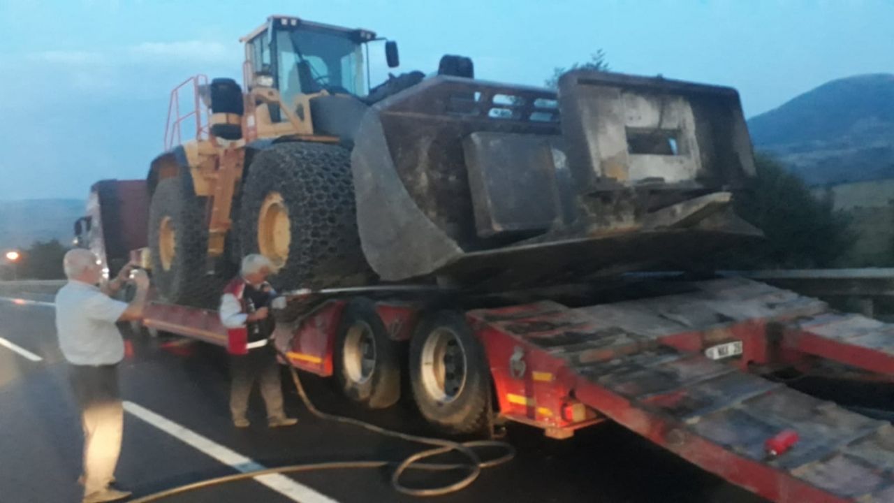 KARABÜK (AA) - Karabük'ün Eskipazar ilçesinde iş makinesi yüklü tırın seyir halindeyken lastikleri yandı.