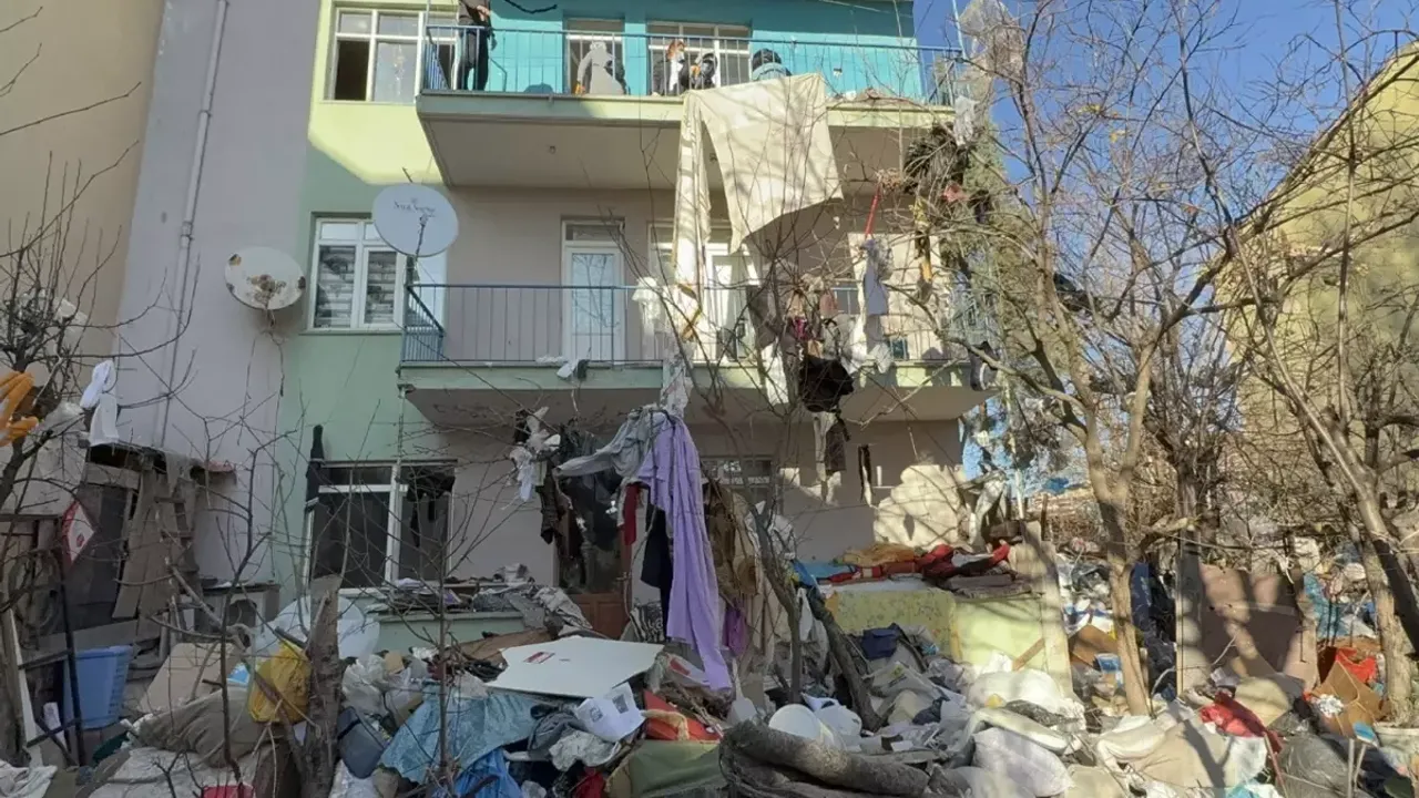 Sadece evin içi değil, bahçe ve bina çevresinin de çöplerle kaplı olduğu görüldü. Kötü kokunun çevreye yayılmasının da bu nedenle olduğu ifade edildi.