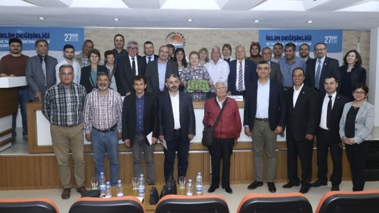 Dünya Gazetesi Tarım Yazarı Ali Ekber Yıldırım, İTÜ Öğretim Üyesi ve Sürdürülebilir Üretim ve Tüketim Derneği Başkanı Prof. Dr. Filiz Karaosmanoğlu ile İTÜ Uçak ve Uzay Bilimleri Fakültesi Meteoroloji Mühendisliği Bölümü Öğretim Üyesi Prof. Dr. Mikdat Kadıoğlu’nun konuşmacı olarak yer aldığı etkinliğin açılışında konuşan MTSO Başkanı Şerafettin Aşut, tarımın dünyadaki en ideal ekosistemlerinden biri olan, tarihte tarımla başlayan medeniyetlere ev sahipliği yapan Akdeniz Havzasının, iklim değişikliğinden en çok etkilenen bölge olacağını söyledi. Sıcaklığın artması, yağışların azalması ve havadaki karbondioksit artışını, birincil anlamda tarımı ve bunun ayrılmaz parçaları olan hayvancılığı, balıkçılığı doğrudan etkileyecek bir tehdit olarak gösteren Aşut, "Tarım ve gıda hayat demektir. Şu anda herhangi bir üretimdeki azalış veya artıştan değil, doğrudan etkilenecek olan hayatımızdan bahsediyoruz. Bir var olma sorunundan bahsediyoruz. Elbette iklim deşikliği yeni bir konu değil. Bu, milyonlarca yıldır süregelen normal bir süreç aslında. Sorun, son yüzyılda yaşanan insan kaynaklı etkilerin süreci olmadığı kadar hızlandırmasıdır. Bu anlamda ben olayı bir madalyon gibi iki taraflı görüyorum. Birincisi, bu değişimi hızlandıran insan kaynaklı etkileri azaltmak, ikincisi, bu değişime teknolojiyi kullanarak hazır olmak" dedi.