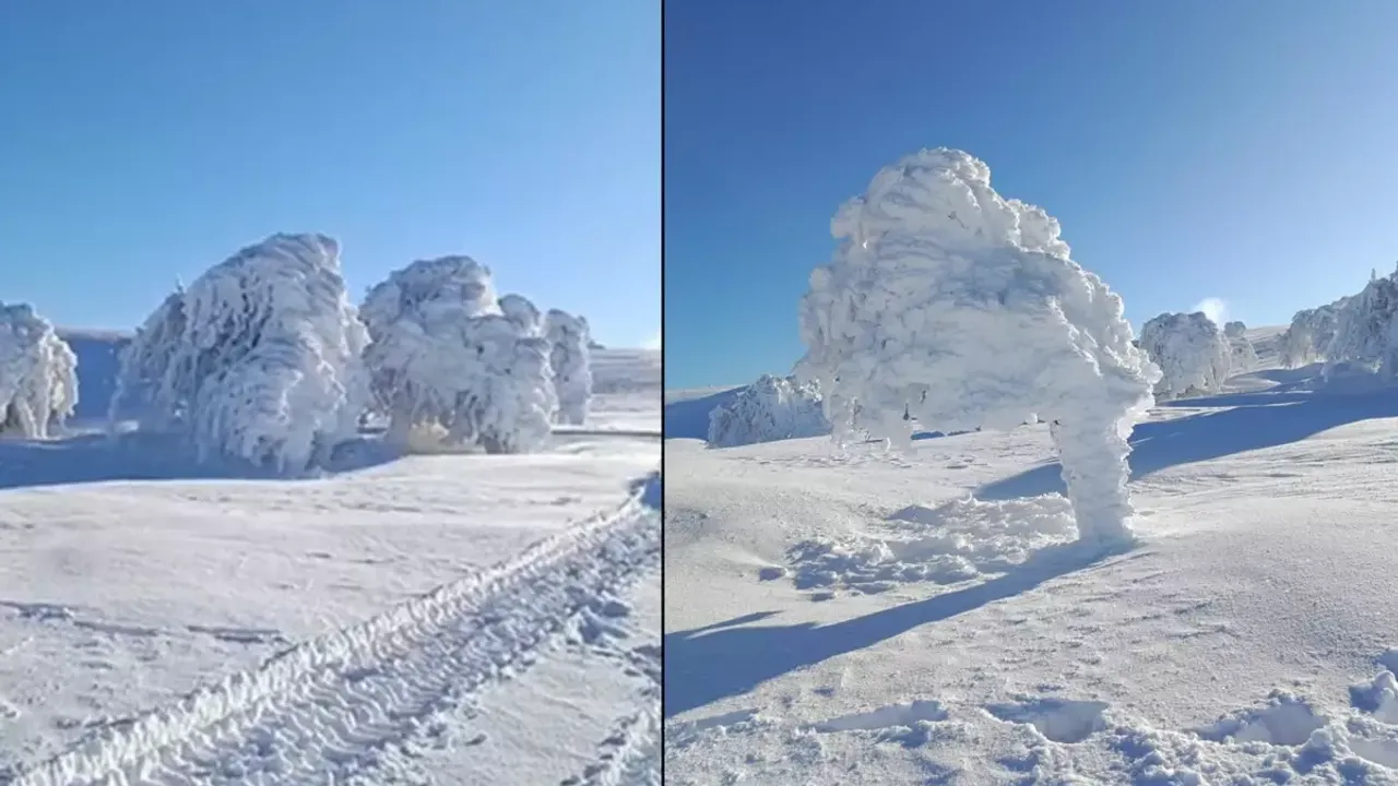 Susuz Yaylası’nda oluşan buz tutmuş ağaçlar ve kar manzaraları, kışın doğaya kattığı eşsiz güzelliği bir kez daha ortaya koyarken, bölge fotoğraf tutkunlarının da ilgisini çekmeye devam ediyor.