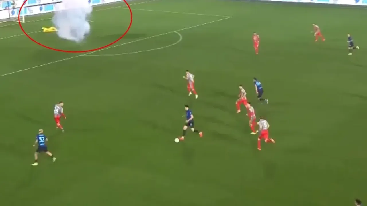 Kaleciye sahada müdahale edilirken hakem karşılaşmayı kısa süreliğine durdurdu. Yoğun duman nedeniyle saha bir süre kontrol altına alınmaya çalışıldı.