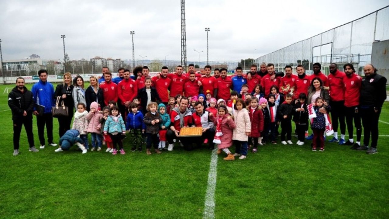 Öte yandan ilkokul öğrencileri antrenmanı ziyaret ederek, futbolculara çiçek verdi.