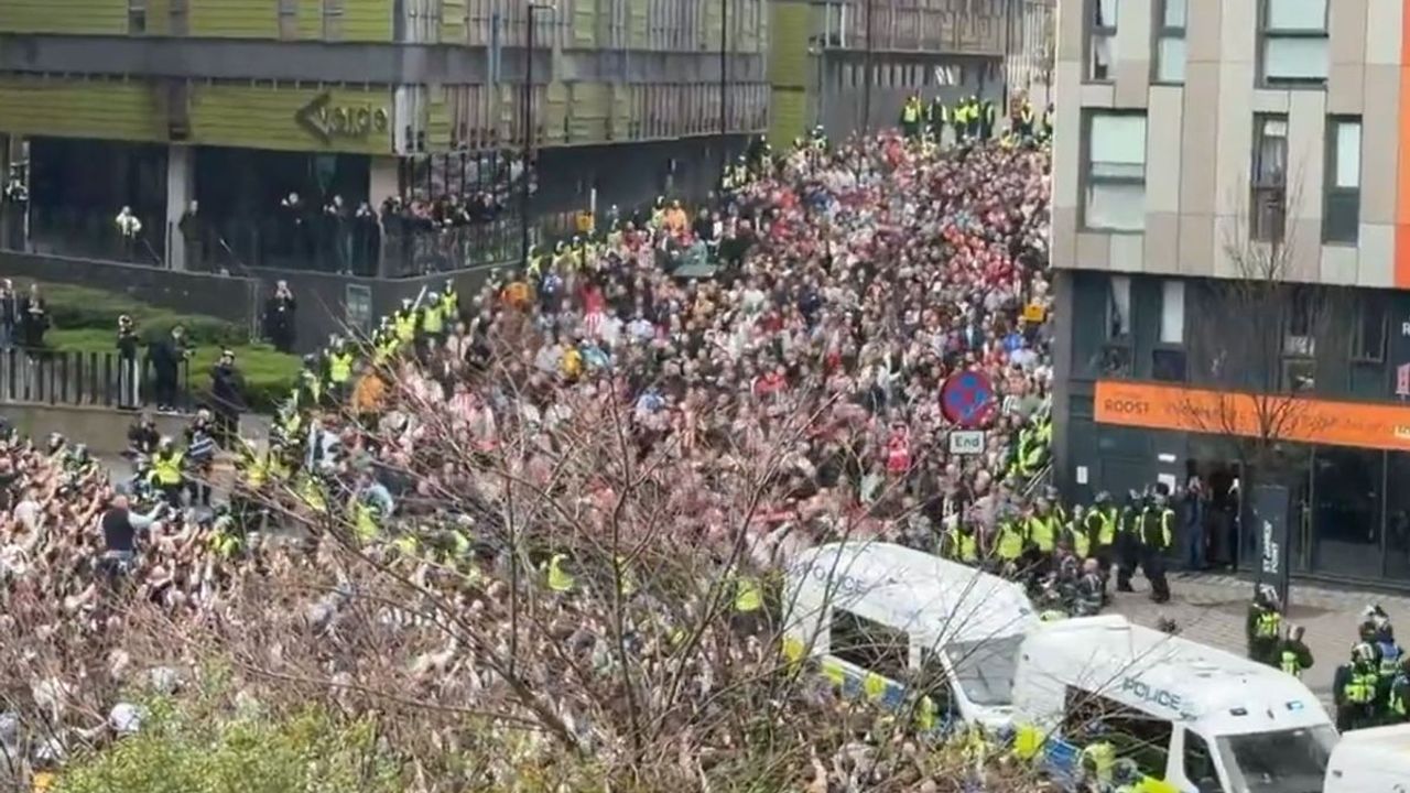 Newcastle deplasmanına giden Sunderland taraftarlarının yürüyüşü, yoğun katılım ve sert atmosferiyle dikkat çekti. Görüntülerde oluşan kalabalık ve coşku, iki takım arasındaki rekabetin boyutunu bir kez daha ortaya koydu.