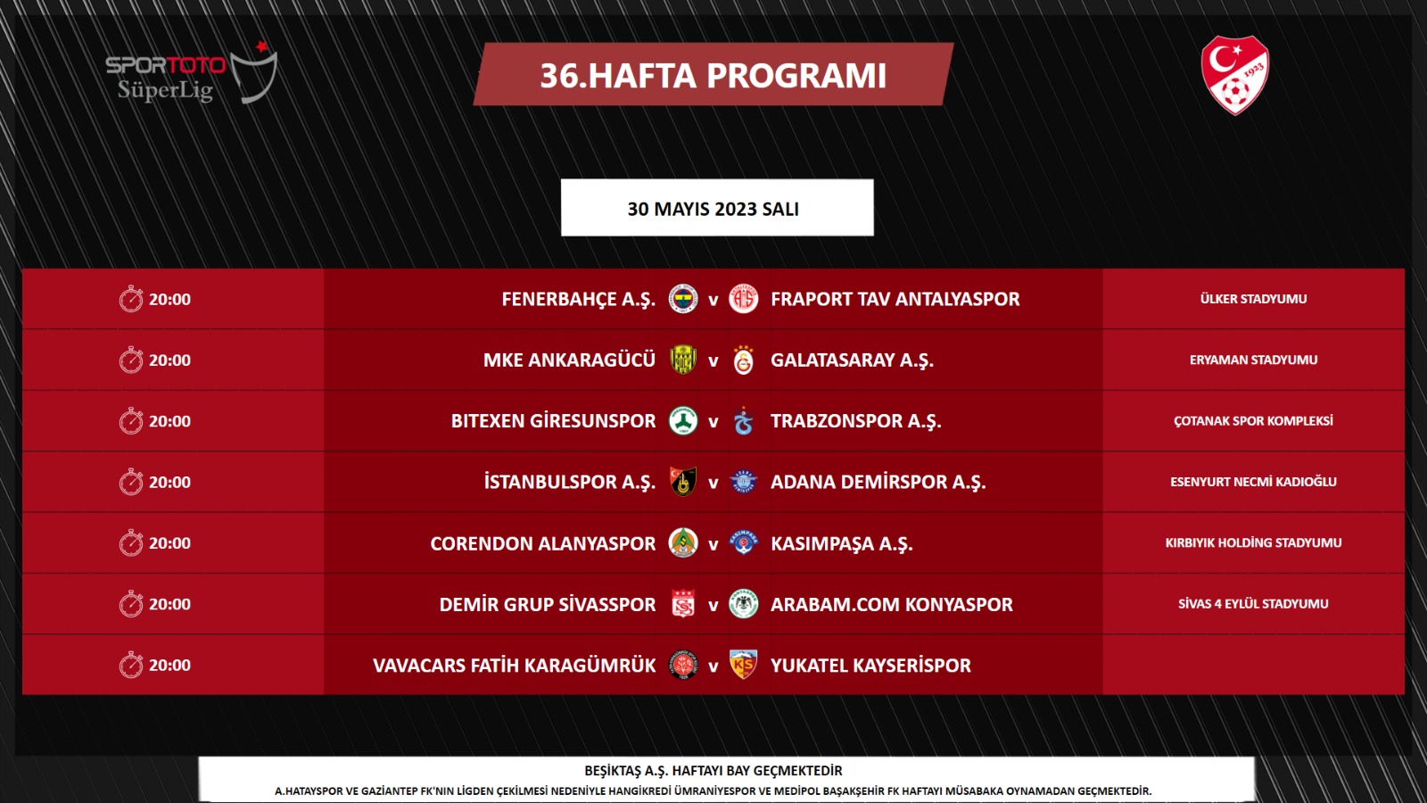 "Spor Toto Süper Lig'de 36. hafta müsabakalarına ilişkin program açıklanmıştır. 28 Mayıs'ta yapılacak olan Cumhurbaşkanı Seçimi nedeniyle ligin 36. hafta müsabakaları 30 Mayıs Salı günü oynanacaktır. VavaCars Fatih Karagümrük - Yukatel Kayserispor müsabakasının oynanacağı stat daha sonra ilan edilecektir."