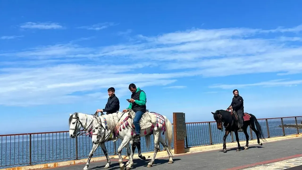 Trabzon’da güneşli havayı fırsat bilen vatandaşlar sahil hattına akın ederken, ortaya çıkan görüntüler alışılmışın dışına çıktı. Sahilde yürüyüş yapanların arasına karışan atlılar, pazar gününe farklı bir renk kattı.