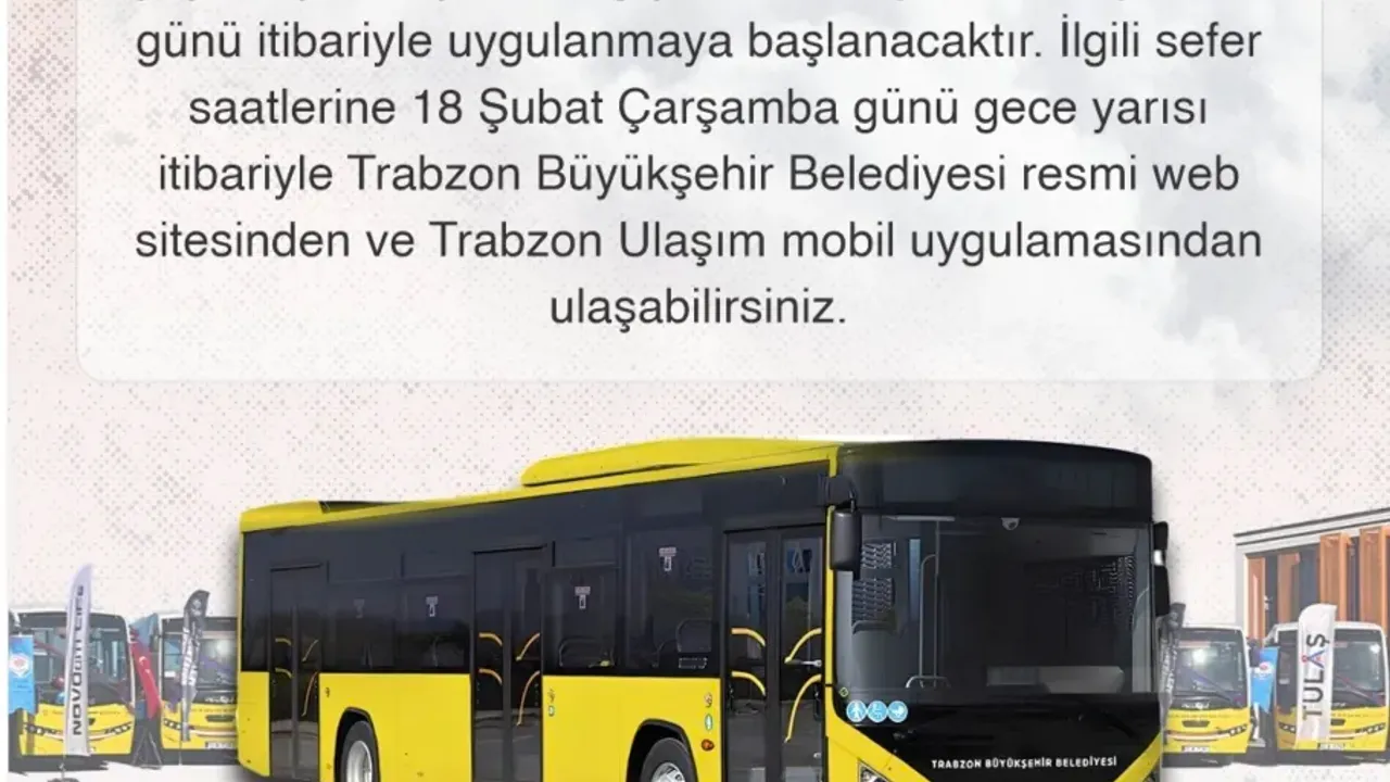 Vatandaşlar güncellenen otobüs saatlerine Trabzon Büyükşehir Belediyesi’nin resmi internet sitesi üzerinden ve Trabzon Ulaşım mobil uygulaması aracılığıyla ulaşabilecek.