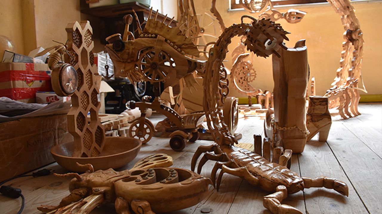 Sancak, gürgen, armut, kiraz ve ceviz ağacından, aralarında balık, arı, akrep, yengeç, masa saati, avize, örümcek, kelebek, lambader ve geminin de bulunduğu çeşitli eşyalar hazırladığını aktardı.