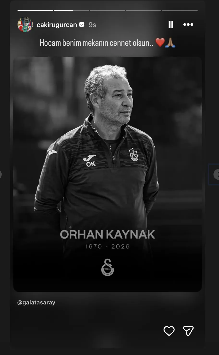 Uğurcan Çakır, Galatasaray - Liverpool maçı sonrası haberi alarak sosyal medya hesabından Orhan Kaynak ile bir fotoğrafını yayınladı. Çakır paylaşımında, "Mekanın cennet olsun hocam.." ifadesini kullandı.