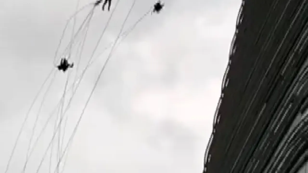 Görüntülerde işçilerin rüzgârın etkisiyle defalarca savrulduğu, buna rağmen kontrollü bir şekilde inmeye çalıştığı görüldü.