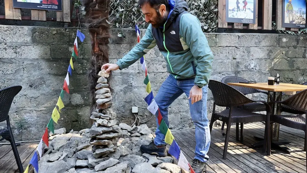 Sonbay, 12 yıl önce açtığı kafeyi zamanla dağcılık konseptiyle donattı. Tırmandığı zirvelerden getirdiği taşların yanı sıra dağcı arkadaşlarına ait ekipmanları da sergileyen Sonbay, dekorasyonun 11 yılı aşkın sürede oluştuğunu söylüyor.